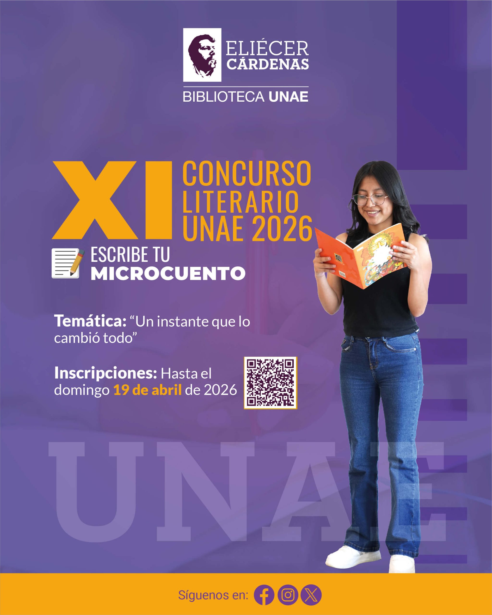 La Biblioteca Eliécer Cárdenas de la Universidad Nacional de Educación, organiza el XI Concurso Literario UNAE 2026 “Escribe tu Microcuento”, con la finalidad de promover e incentivar la expresión artística y literaria como medio de creación y comunicación, a través del cual los estudiantes, docentes y comunidad educativa en general pueden materializar sus ideas, pensamientos y sentimientos.