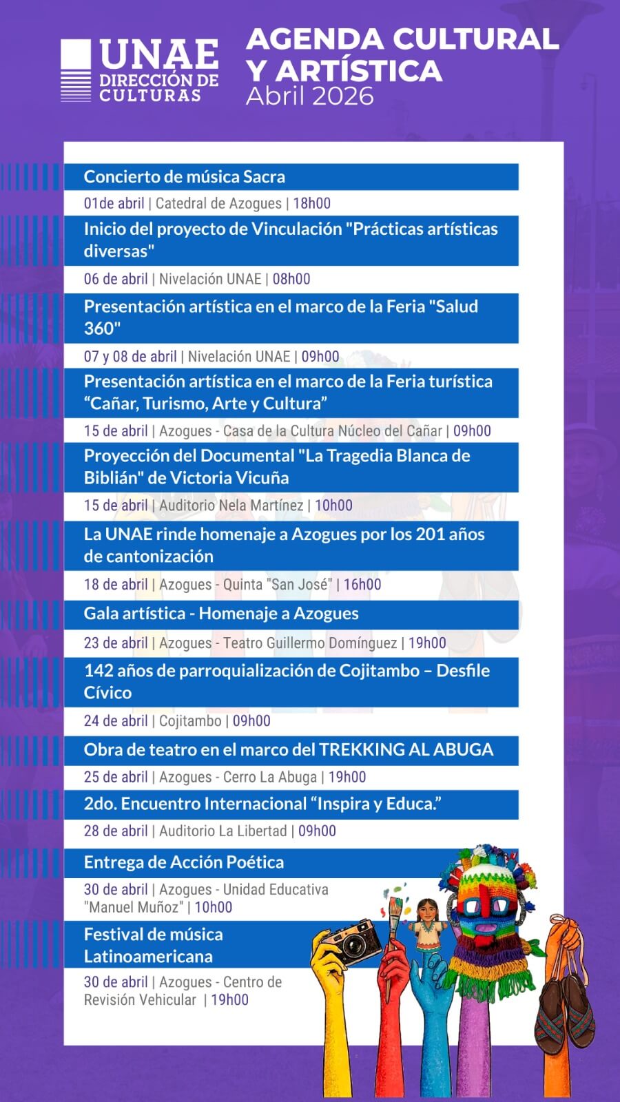 Cuenta con una Agenda Anual de Eventos, mediante la cual visibiliza la diversidad cultural y las prácticas artísticas a nivel institucional, local, regional y nacional. Esto se logra a través de la articulación ecosistémica de la Universidad en la que participan estudiantes, personal administrativo y académico de la UNAE.