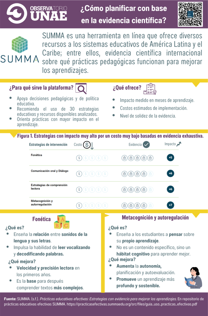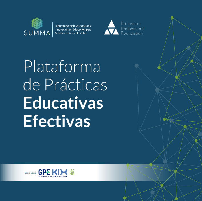 La Plataforma de Prácticas Educativas Efectivas de SUMMA es una herramienta en línea que ofrece diversos recursos a los sistemas educativos de América Latina y el Caribe; entre ellos, evidencia científica internacional de alta calidad sobre qué prácticas pedagógicas funcionan para mejorar los aprendizajes. La plataforma reúne 30 estrategias educativas, cada una acompañada de información clave sobre su impacto promedio en el aprendizaje (expresado en meses de progreso), el nivel de solidez de la evidencia, y una estimación de los costos de implementación. Su propósito es servir como un punto de partida para la reflexión pedagógica, el diálogo profesional y la adaptación contextual de las prácticas educativas.