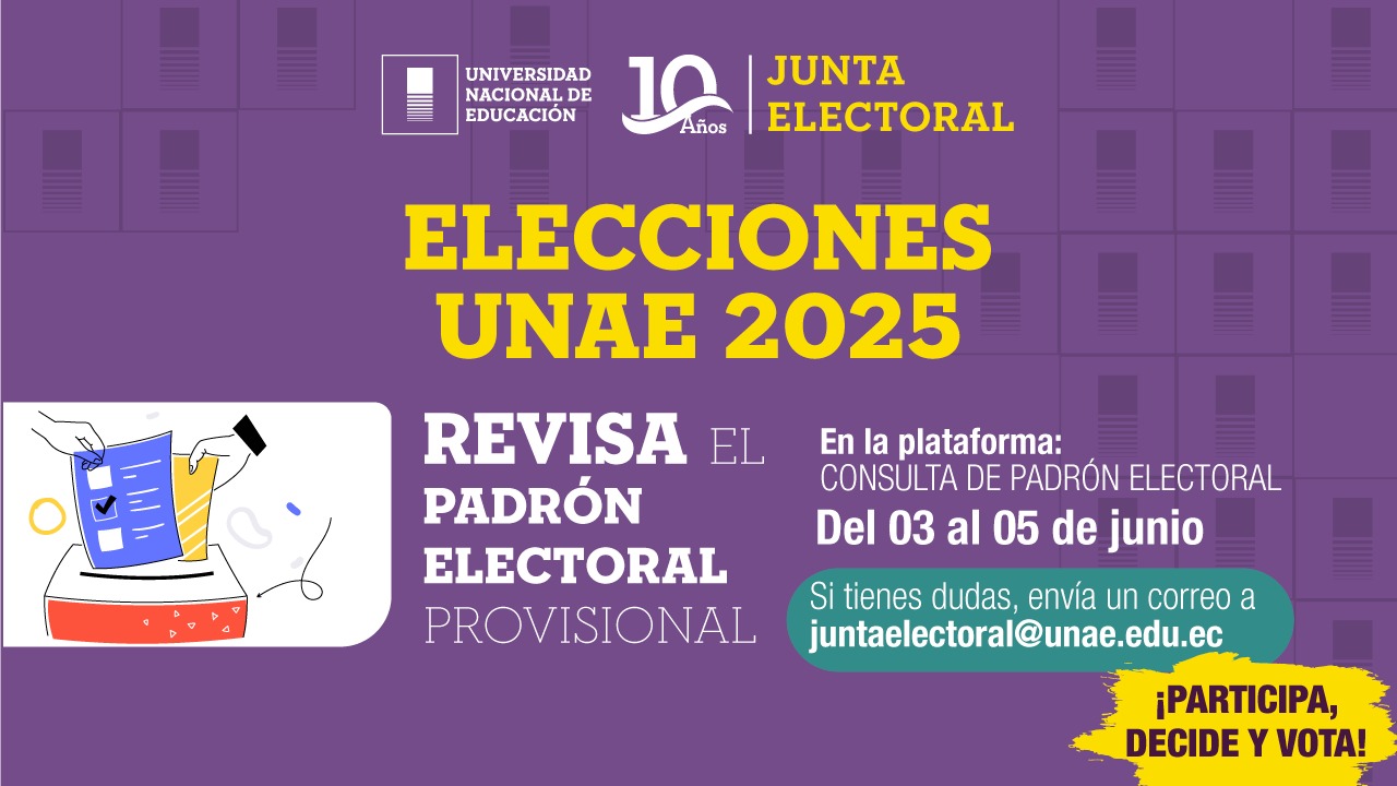 Invitamos al personal académico, estudiantes, servidores y trabajadores, a revisar el Padrón Electoral UNAE 2025.