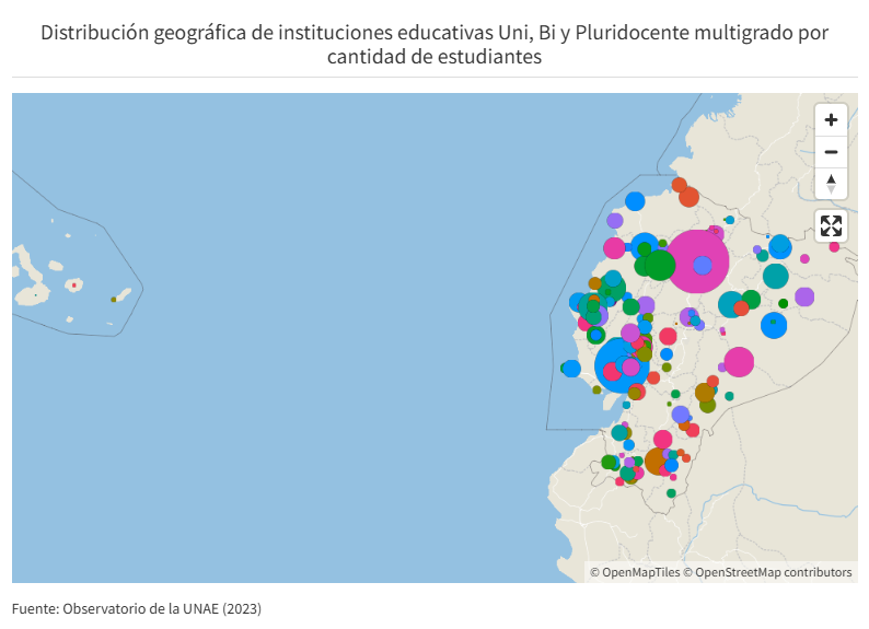 Mapa de la distribución geográfica de instituciones educativas uni, bi y pluridocentes multigrado en Ecuador, clasificadas según el número de estudiantes.