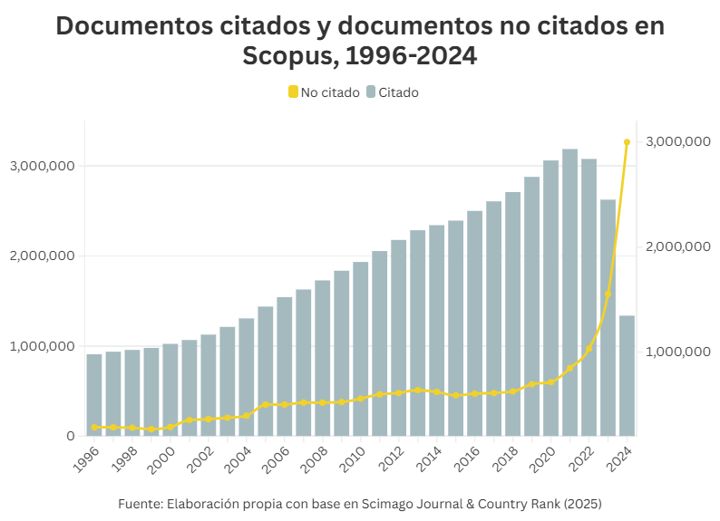 Tendencia histórica del impacto académico: comparación entre documentos citados y no citados en Scopus durante el período 1996-2024.