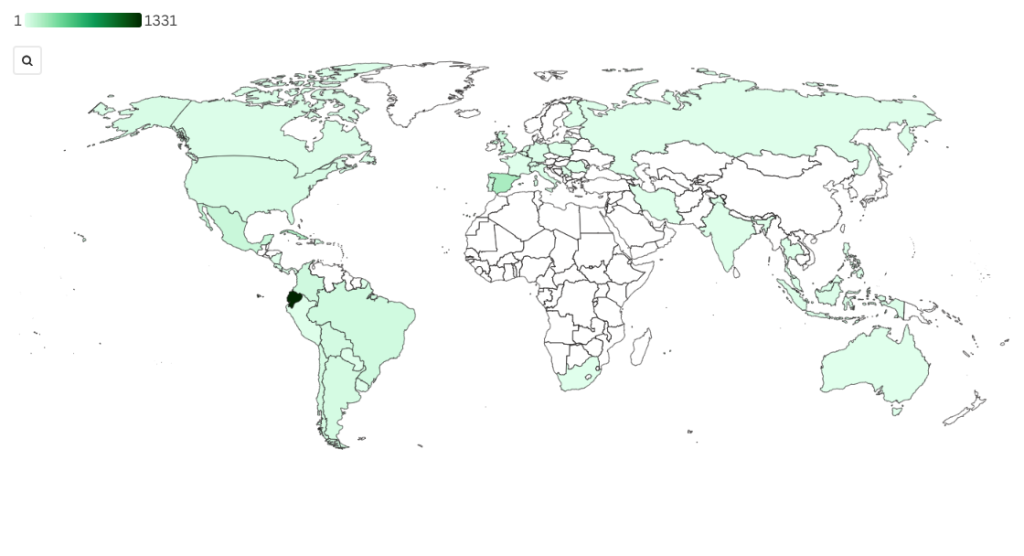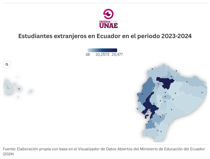 Mapa de la distribución de estudiantes internacionales en Ecuador durante el período académico 2023-2024.