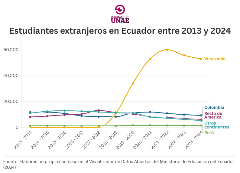 Evolución de la matrícula de estudiantes extranjeros en Ecuador entre 2013 y 2024, desagregada por país de origen.