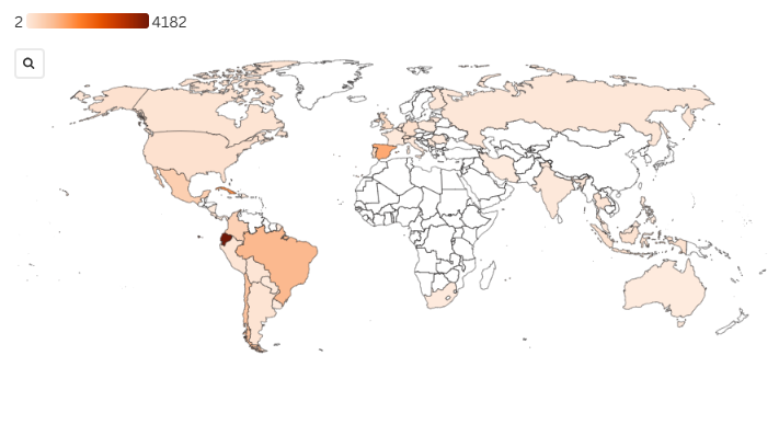 Distribución global de publicaciones de los investigadores de la UNAE según número de documentos indexados en diferentes países.