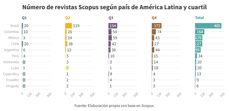 Distribución de revistas latinoamericanas indexadas en Scopus, organizadas por país y nivel de impacto (cuartil).