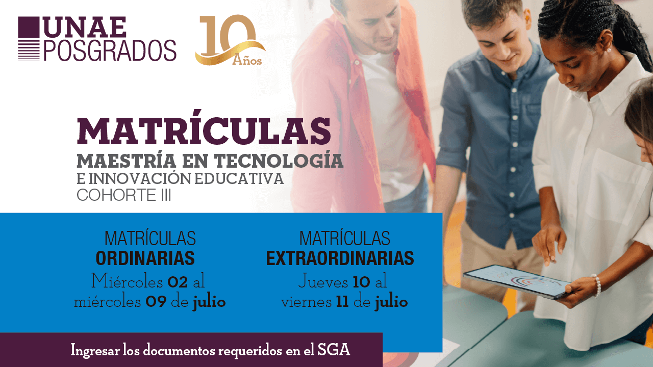 La Secretaría General de la Universidad Nacional de Educación, informa a los admitidos y público en general que, el proceso de matrículas para los estudiantes del programa de Maestría en Tecnología e Innovación Educativa III Cohorte, se llevará a cabo de acuerdo al siguiente cronograma: