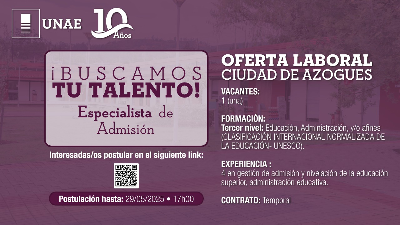 La Universidad Nacional de Educación requiere contratar un/una Especialista de Admisión para la ciudad de Azogues.
