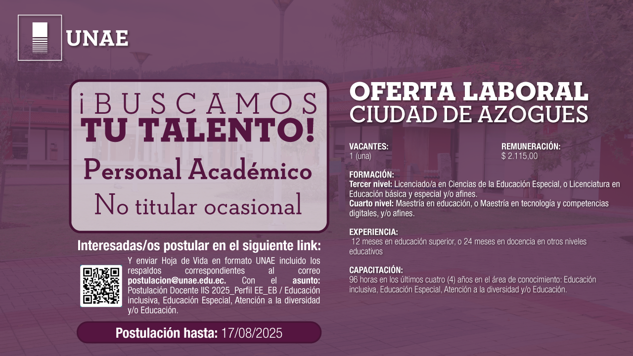 La Universidad Nacional de Educación requiere contratar Personal Académico No Titular Ocasional para la ciudad de Azogues.