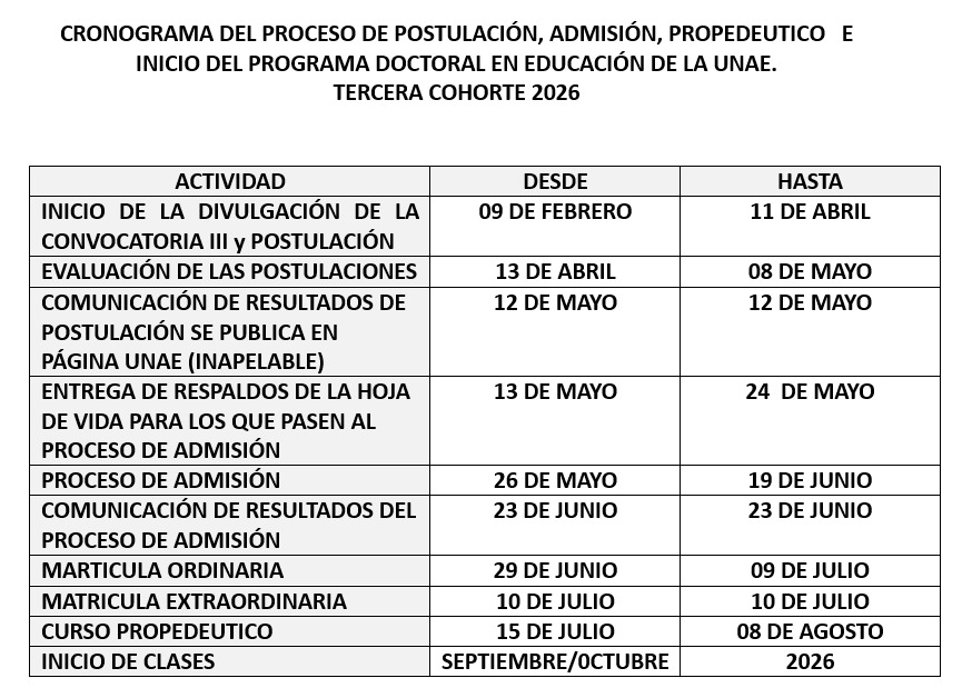 Para cualquier inquietud escribir al correo electrónico: doctoradoeducacion@unae.edu.ec,