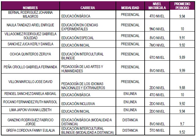 • Artículo 2.- Otorgar los estímulos económicos por excelencia académica a los siguientes estudiantes, quienes recibirán el monto correspondiente a dos salarios básicos unificados: